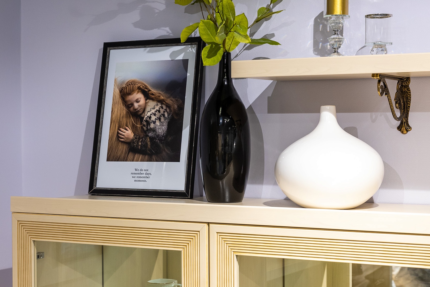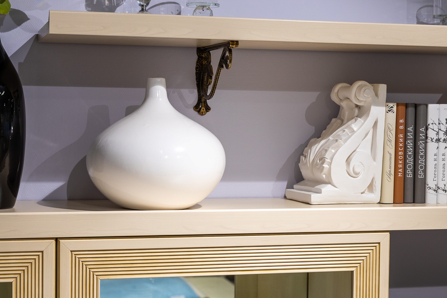 Сдержанная роскошь проявляется в деталях: элегантные латунные ручки, фрезерованные филенки, изящные витые менсолодержатели. Ручное патинирование придает фасадам налет старины, качественное лаковое покрытие устойчиво к выцветанию, не желтеет со временем. Надежная, продуманная фурнитура — петли с доводчиками, накладные демпферы, скрытые направляющие — превращает эксплуатацию гарнитура в истинное удовольствие.
