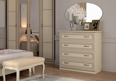 Внешнюю массивность шкафов облегчают открытые навесные полки и застекленные дверцы со внутренними зеркальными стенками. Благодаря этому меблировка не выглядит громоздкой, излишне тяжелой. Красивый природный рисунок подчеркнут патиной и лаком с шелковистой текстурой. Три напольных шкафа, настенные полочки, компактная тумба позволят разместить все самое необходимое.