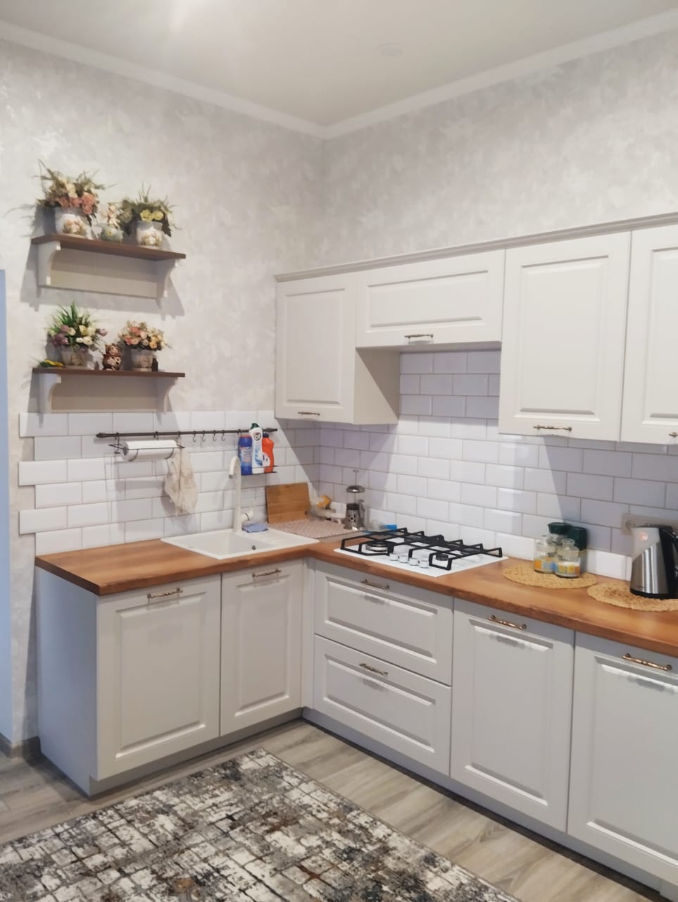 Французская элегантность вкупе со сдержанным дизайном подойдут для создания кухни в стиле прованс, модерн или кантри. Вместительные шкафы декорированы пилястрами, карнизами, патинированными филенками. За стеклянными фасадами с расстекловкой можно расположить красивую посуду, дорогое вино или необычный декор. Распределение раковины и варочной панели по разным сторонам помещения дает возможность создать полноценный рабочий треугольник. Обилие ящиков, отсеков, отделений, шкафов различной ширины и глубины позволяет разместить все необходимое. Петли и направляющие снабжены доводчиками, что обеспечивает тихий и плавный ход выдвижных и распашных механизмов.