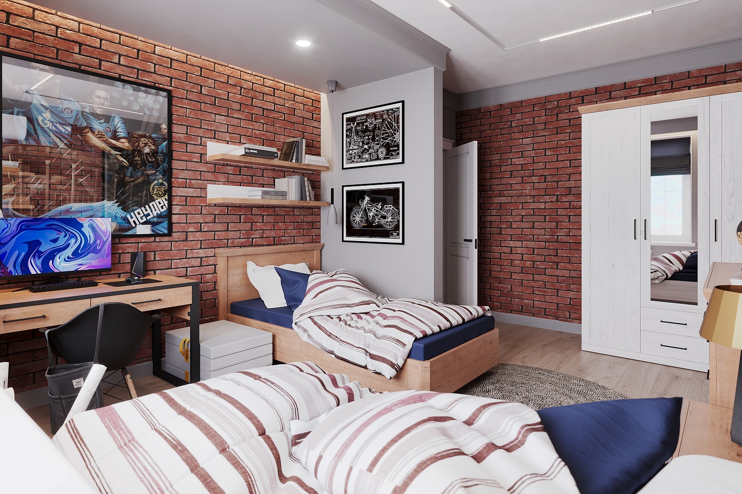 - Молодежная будет гармонировать как с классическими оттенками белого, серого, коричневого, так и с текстурами — деревом, бетоном и кирпичом;